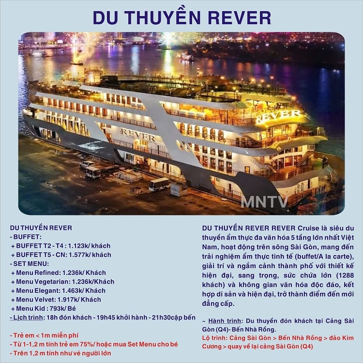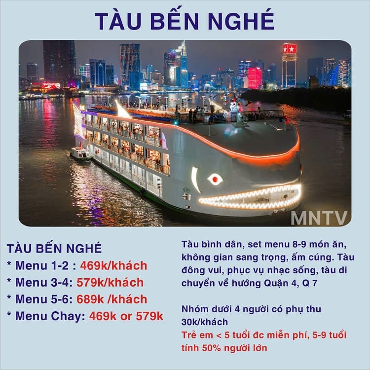 Lưu ý: Nên đặt vé tàu ăn tối trên sông Sài Gòn sớm 3 - 5 ngày hoặc sớm hơn vào dịp cao điểm (cuối tuần và lễ Tết) để chắc chắn có tấm vé vị trí ghế đẹp nhất trên du thuyền.