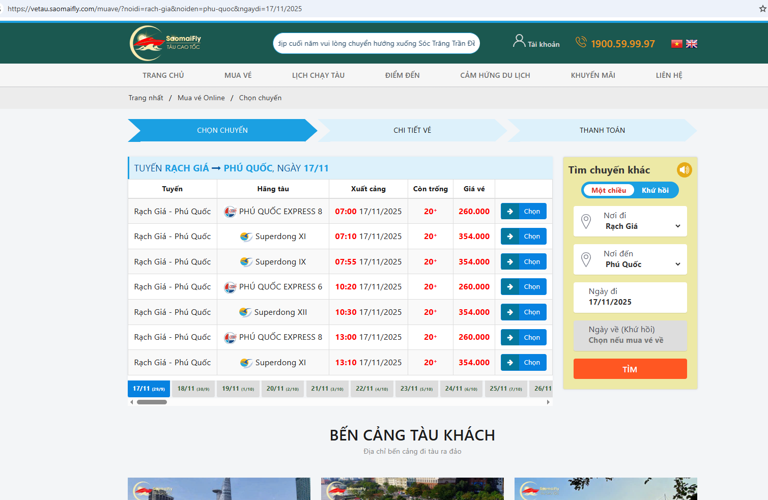 Tại trang chủ chọn tuyến tàu muốn di chuyển (chẳng hạn: Rạch Giá → Phú Quốc, tàu Phú Quốc Express)