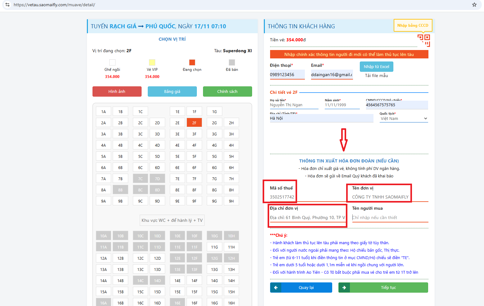 2/ Điền đầy đủ thông tin xuất hoá đơn gồm: mã số thuế, tên đơn vị, địa chỉ đơn vị và tên người mua vé tàu (chỉ nhập nếu cần thiết).