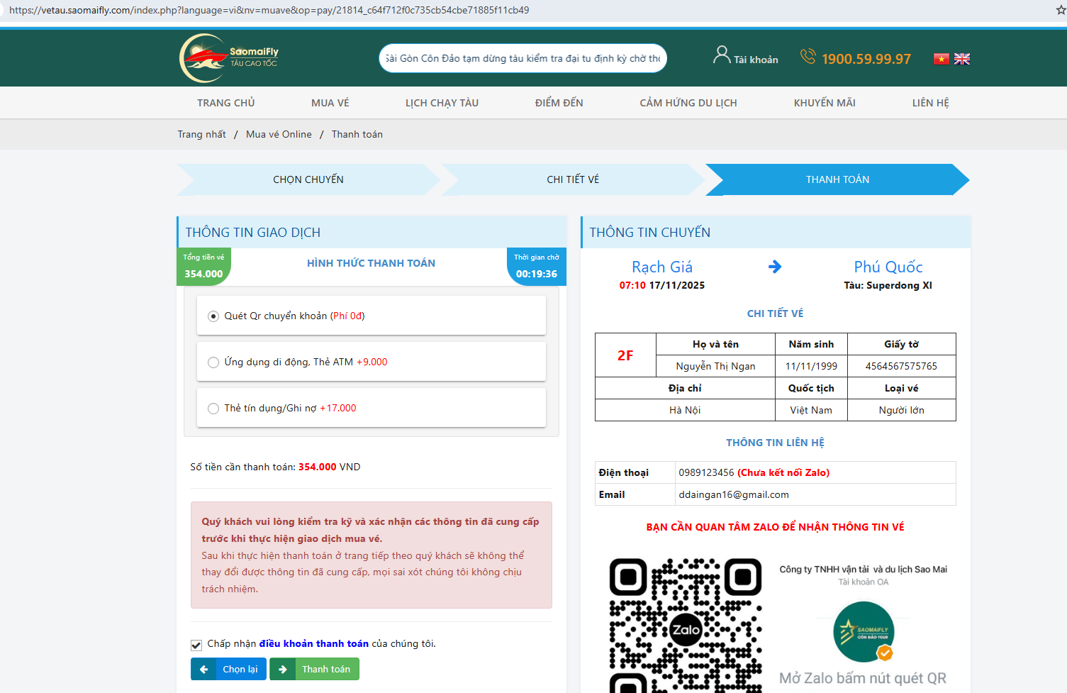 Sau đó điền đầy đủ thông tin khách hàng gồm: điện thoại, email, họ tên, năm sinh, CCCD, địa chỉ, quốc tịch.