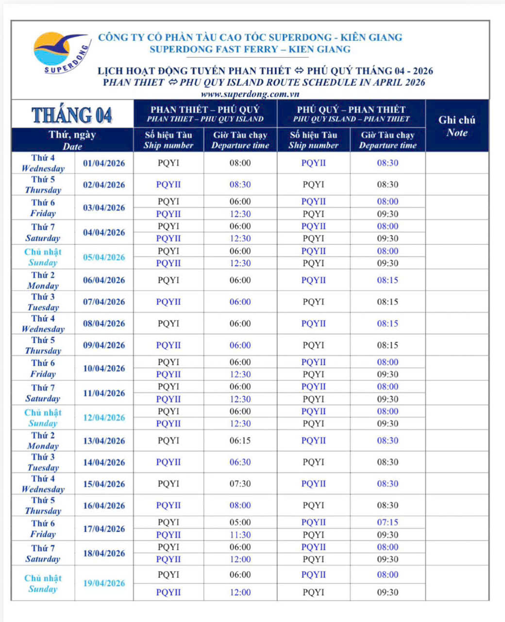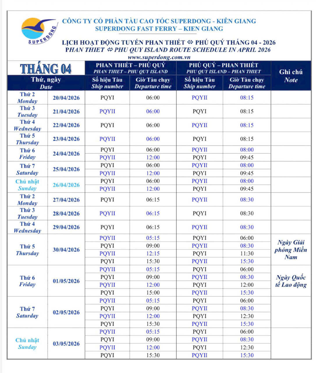 Tàu Superdong xin thông báo tới Quý khách hàng lịch tàu Superdong Phan Thiết - Phú Quý 4/2026: