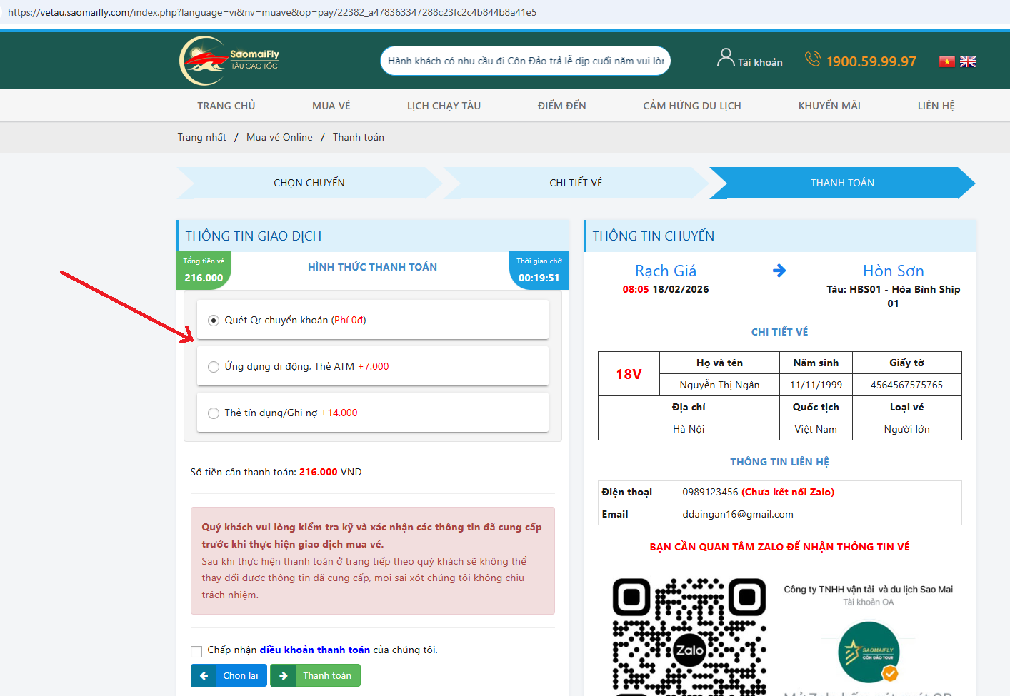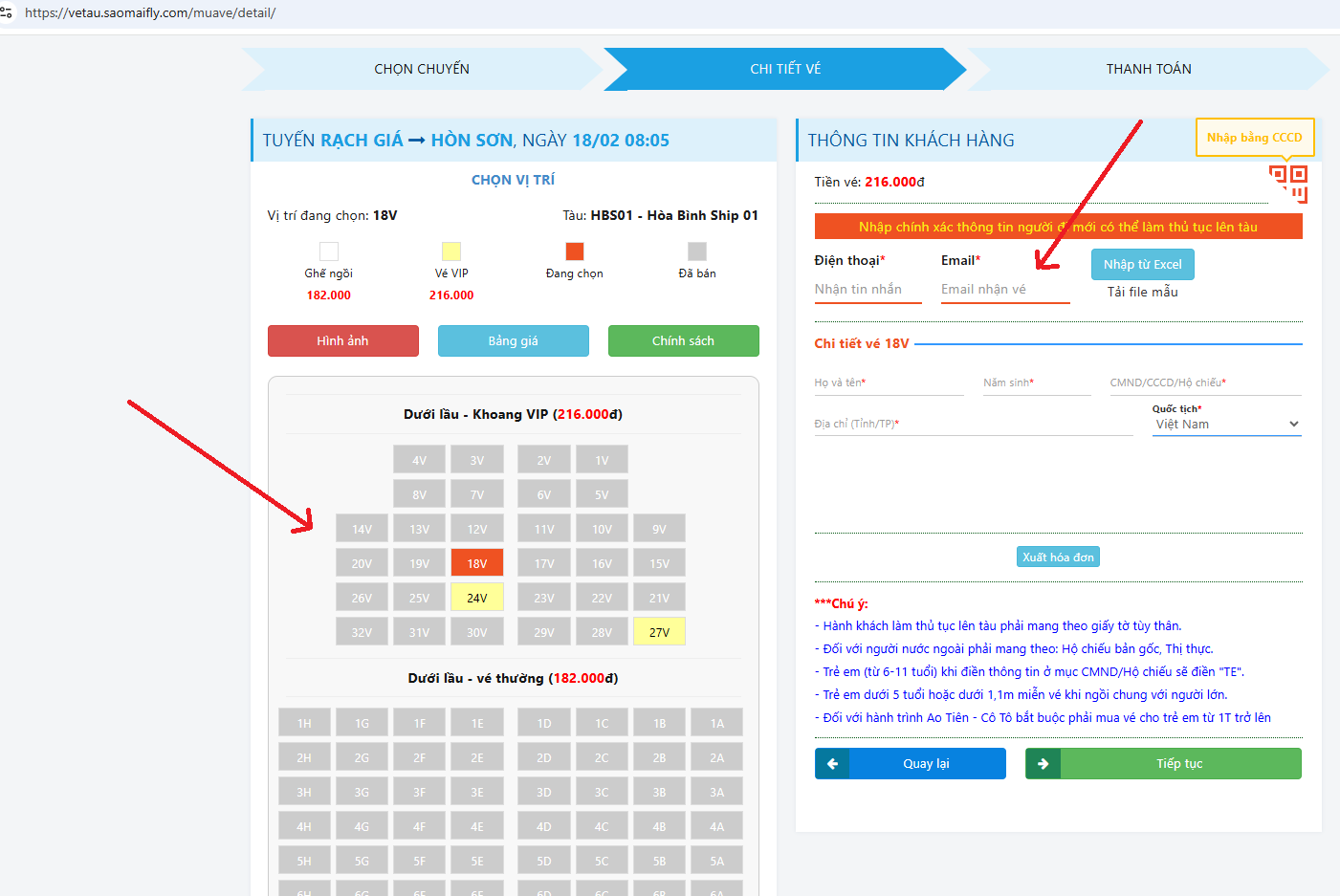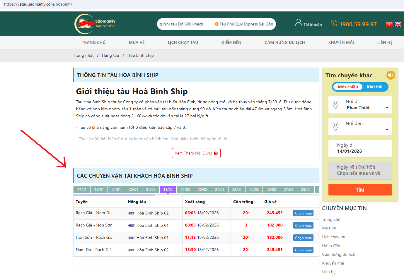 Đặt vé tại: https://vetau.saomaifly.com/hoabinh/ (chọn ngày đi) và chọn chuyến tàu (Hoà Bình Ship) có thời gian khởi hành phù hợp bằng cách click “chọn mua”.