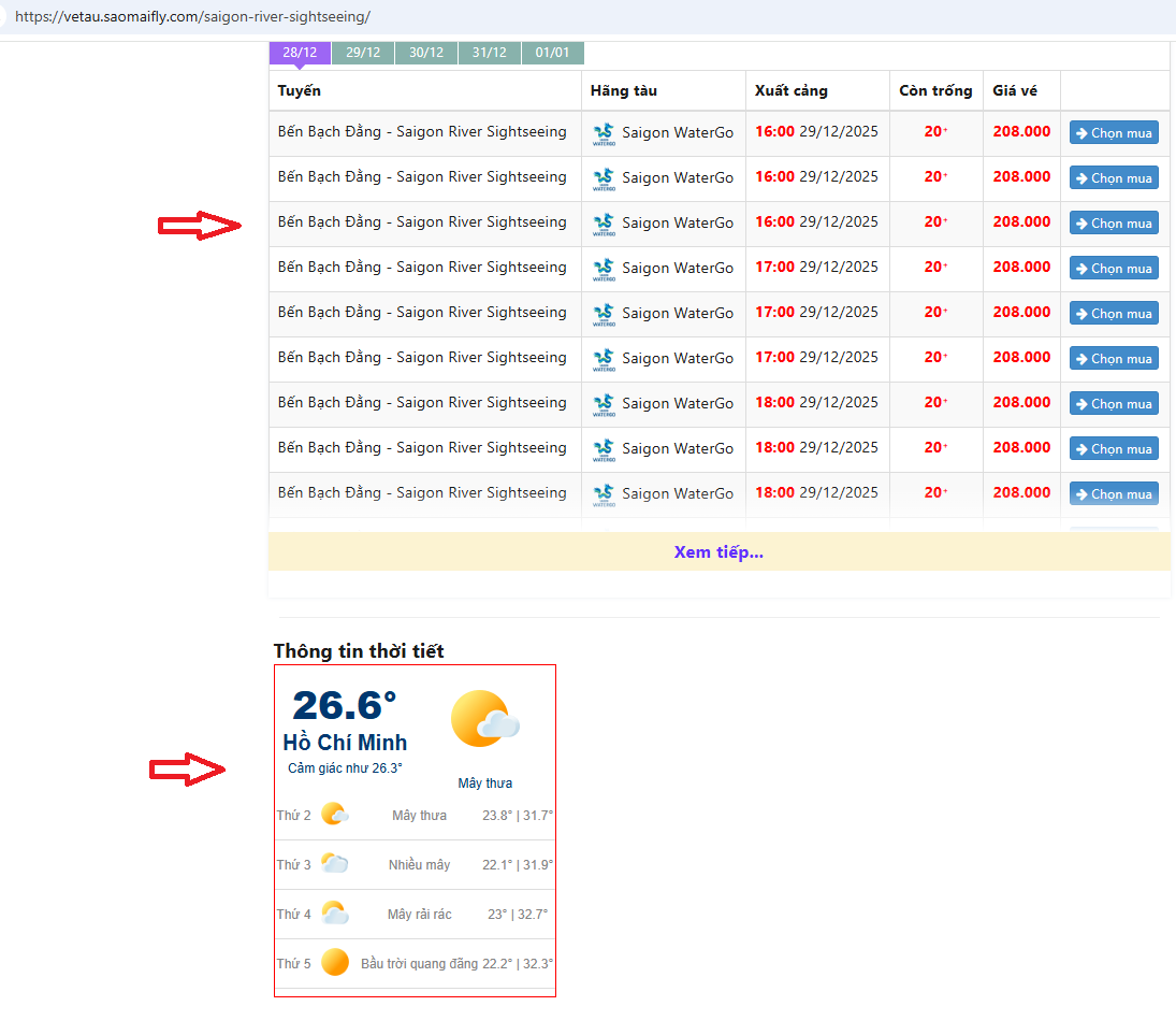 Khi đặt vé tàu trên sông Sài Gòn tại Saomaifly hành khách có thể dễ dàng tra cứu thông tin thời tiết về điểm đến (Sài Gòn) và chủ động kế hoạch cho chuyến đi.