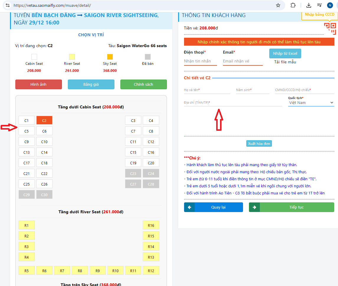 Quý khách vui lòng kiểm tra kỹ và xác nhận các thông tin đã cung cấp trước khi thực hiện giao dịch mua vé. Sau khi thực hiện thanh toán ở trang tiếp theo quý khách sẽ không thể thay đổi được thông tin đã cung cấp, mọi sai sót chúng tôi không chịu trách nhiệm.